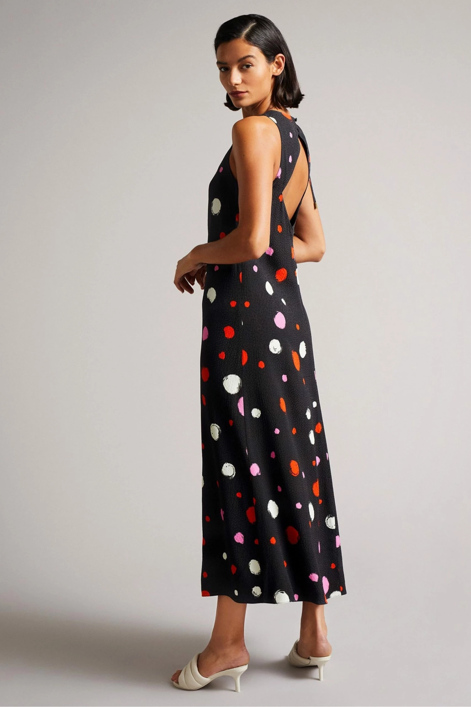 Add a statement style to your wardrobe with this Lizzzee dress from Ted Baker. Designed in a midi length with ruched side detailing, open back and two-button fastening.