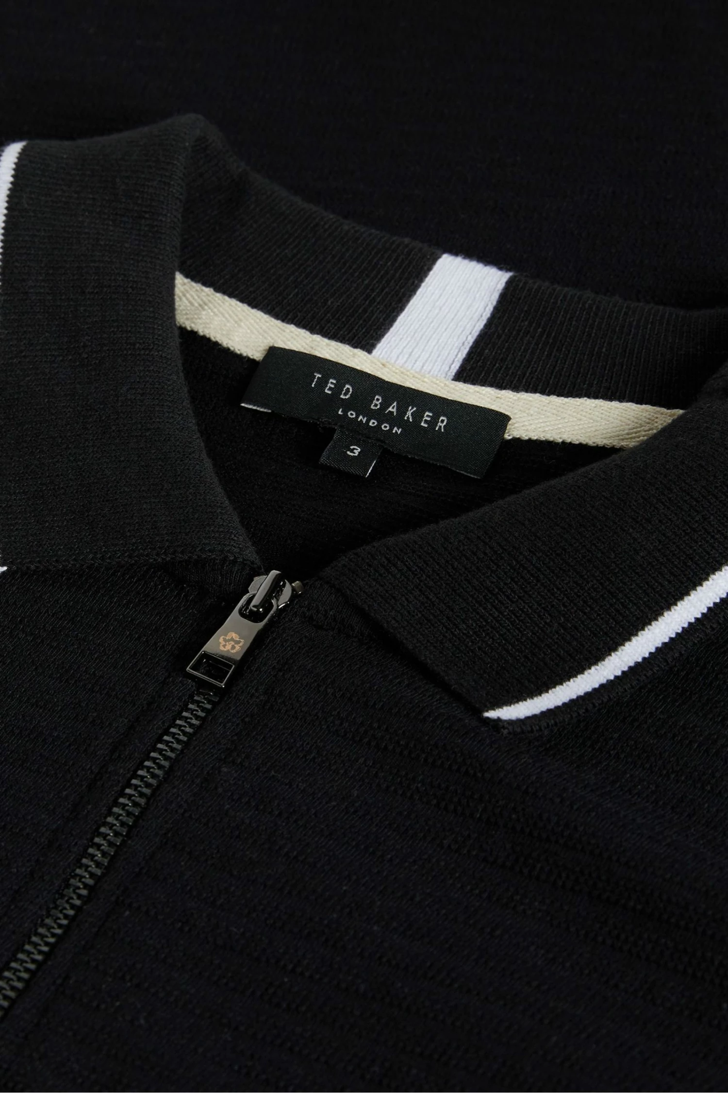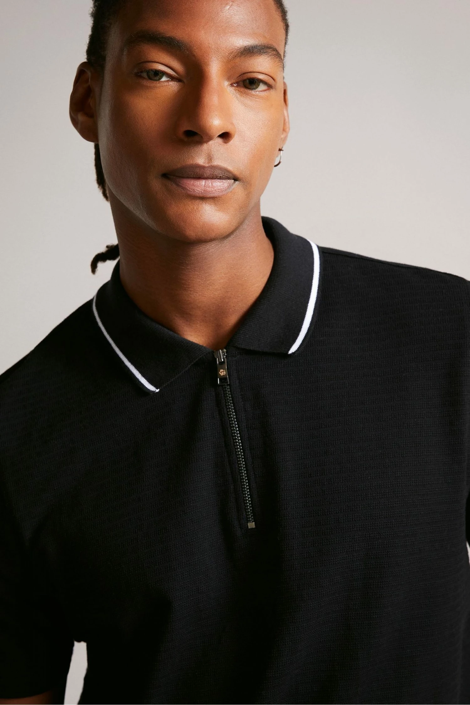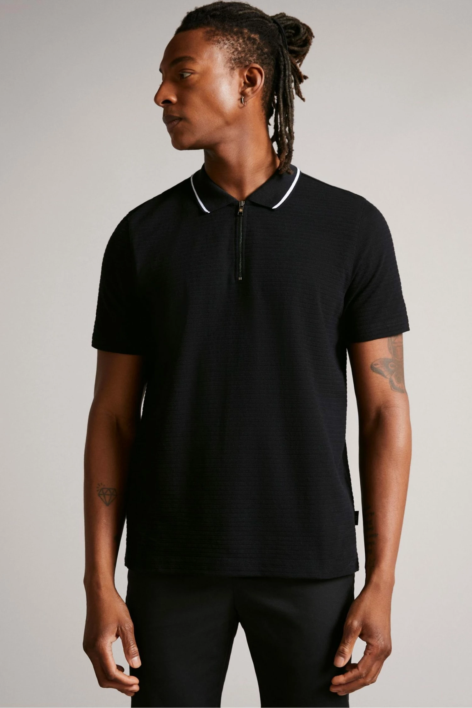 Update your everyday wardrobe with this Buer polo shirt from Ted Baker. In a stylish black colourway with textured fabric, half zip fastening, white trim details and Ted Baker branding.