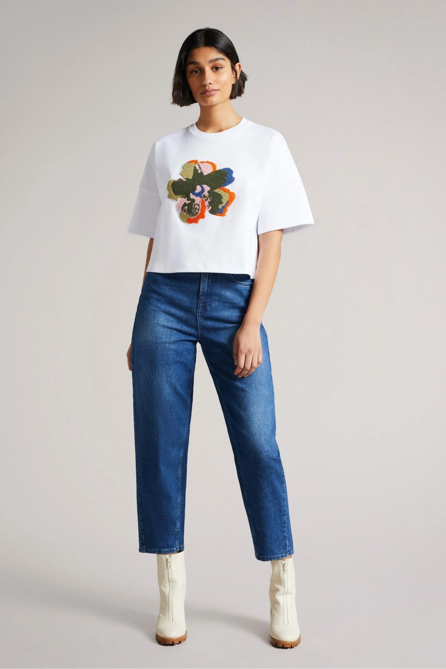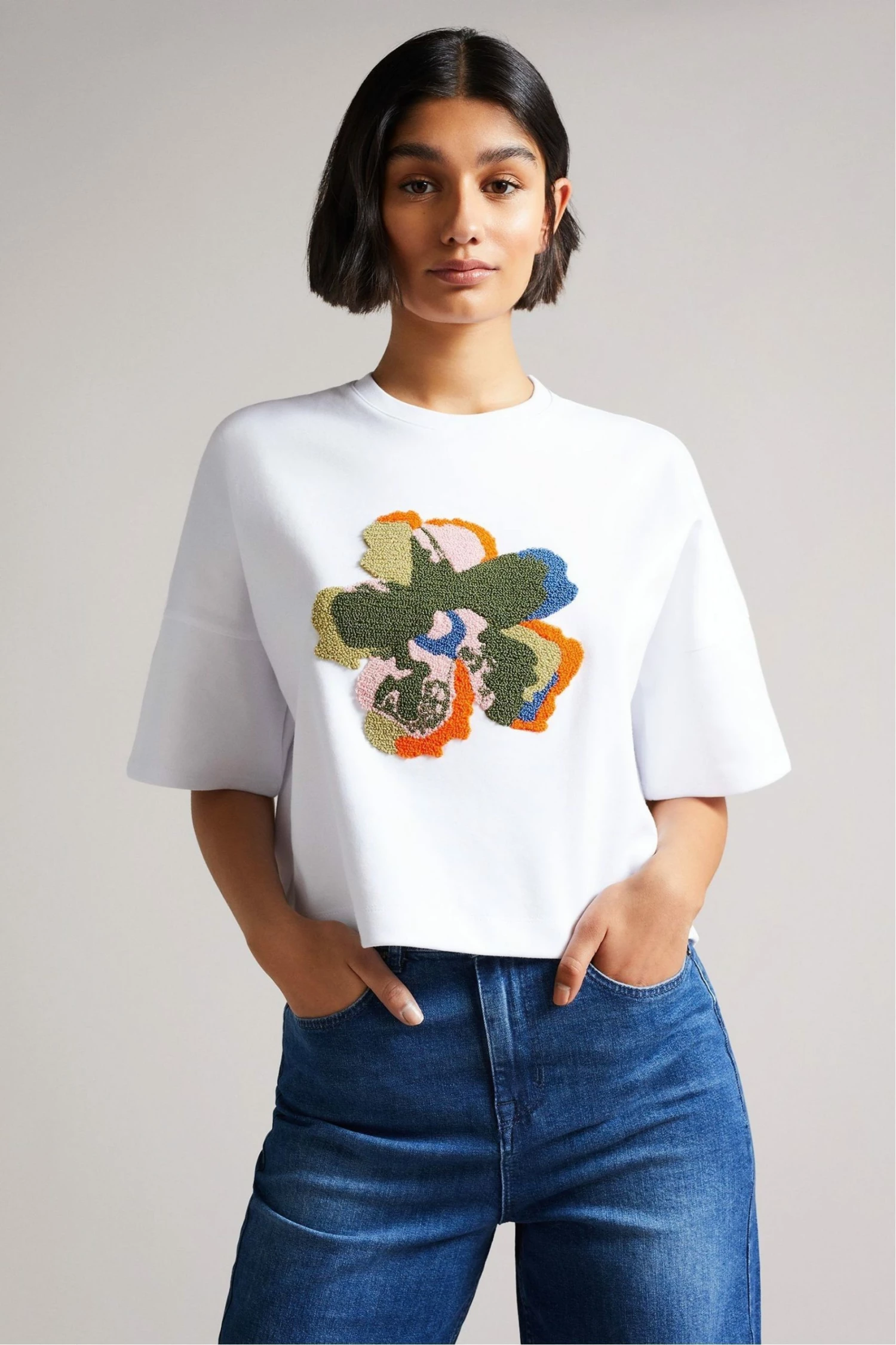 Execute simplistic elegance with ease with ZSARAH. An item of clothing you ll find yourself calling on again and again, this basic t-shirt is elevated thanks to the cropped design, which will look fabulous when worn with a pair of high-waisted jeans. Meanwhile, the bold Ted Baker magnolia print will help to brighten up any casual outfit. The fabric of this product is made of 82% organic cotton. Organic cotton has a proven lower environmental impact than conventional cotton, as it reduces water usage, greenhouse gas emissions, and eliminates the use of harmful chemicals in the farming process.